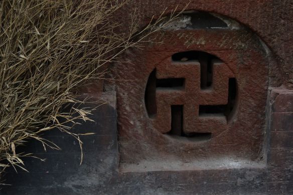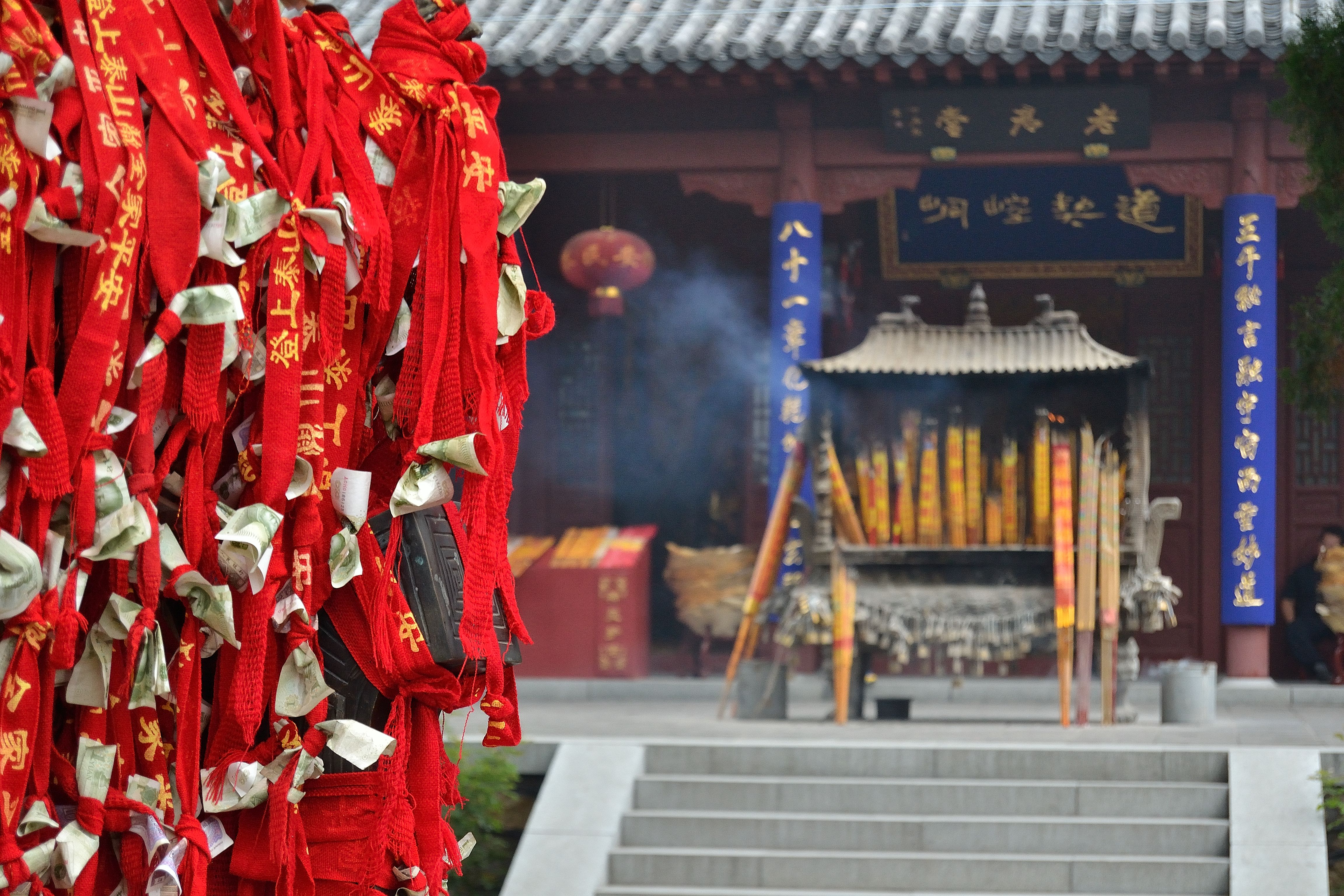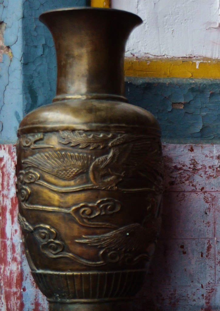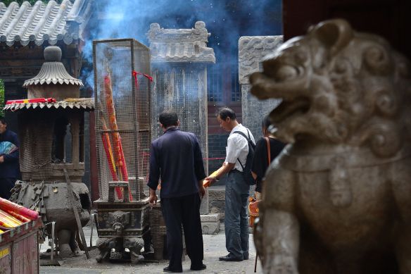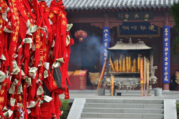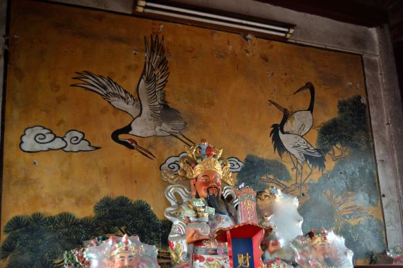Sebbene potesse farmi pure piacere scambiare una parola, mi faccio i fatti miei ed entro nel tempio, l’ultimo. Accendo l’incenso tenuto per l’arrivo a destinazione. Il tempio dell’imperatore di giada. Finalmente, anche in Shandong, in un tempio taoista, trovo una traccia della gru bianca, quando ormai avevo perso le speranze. Un dipinto su muro che fa da sfondo ad un altare. Due gru su un lato e una a sinistra che spicca il volo e rivolge lo sguardo verso il basso, in un bellissimo tramonto. Non so a quando risalisse. Il tempio era molto antico.