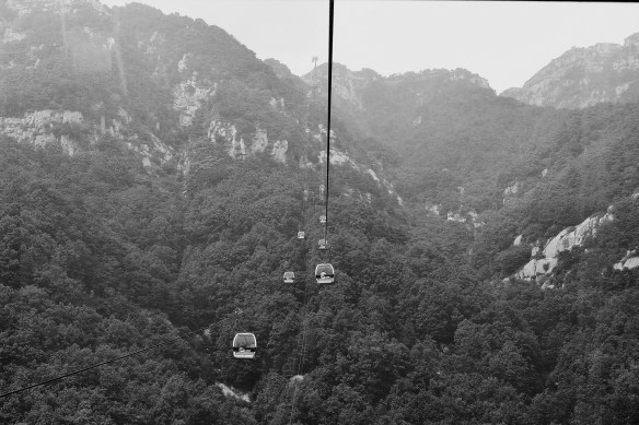 Devo tornare indietro ma questa volta funivia = minibus. Appena ferma a controllare la cartina vengo avvicinata dagli italiani di prima (ero abbastanza riconoscibile tra soli turisti cinesi). Mi raccontano che sono parte di un’associazione onlus internazionale “Moto for peace” che sta girando la Cina in 50 giorni ed è composta da poliziotti, carabinieri e gdf di vari paesi. Girano la Cina in moto sponsorizzati dalla Benelli (che ora e’ stata comprata dalla Cina) e incontrano le forze di polizia locali a scopo di amicizia internazionale. Facevano riprese con due telecamere affiancate per l’effetto 3D (cosi’ la mia faccia sudata e appiccicosa si vedrà in 3d chissà dove) per documentare il viaggio. Durante l’anno hanno raccolto soldi da destinare a una specie di crocerossa cinese. Abbiamo fatto due chiacchiere e sono tornata giù in funivia con loro i quali mi hanno offerto la corsa. Fine della comunicazione di servizio sugli unici italiani oltre me sul TaiShan.