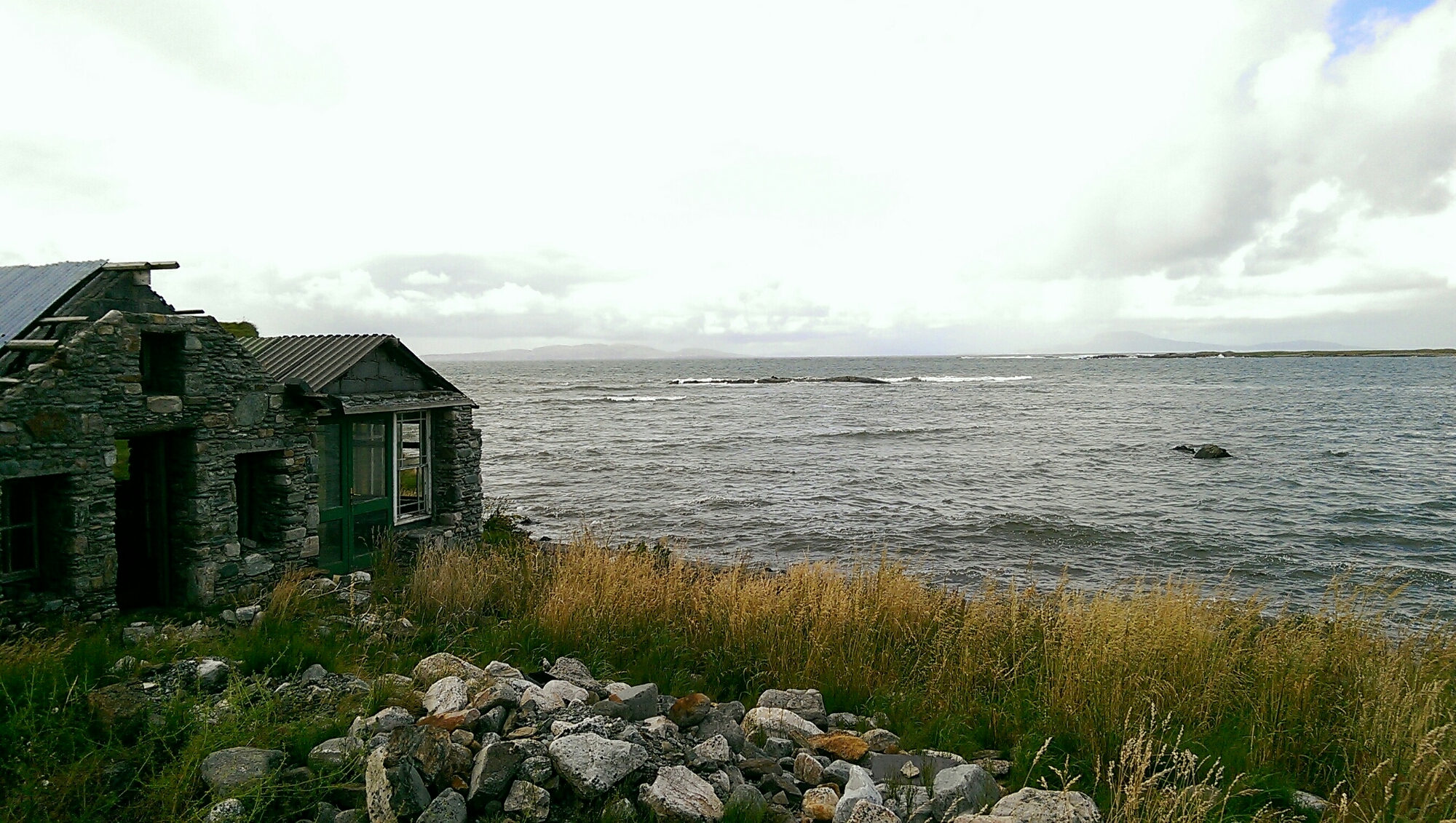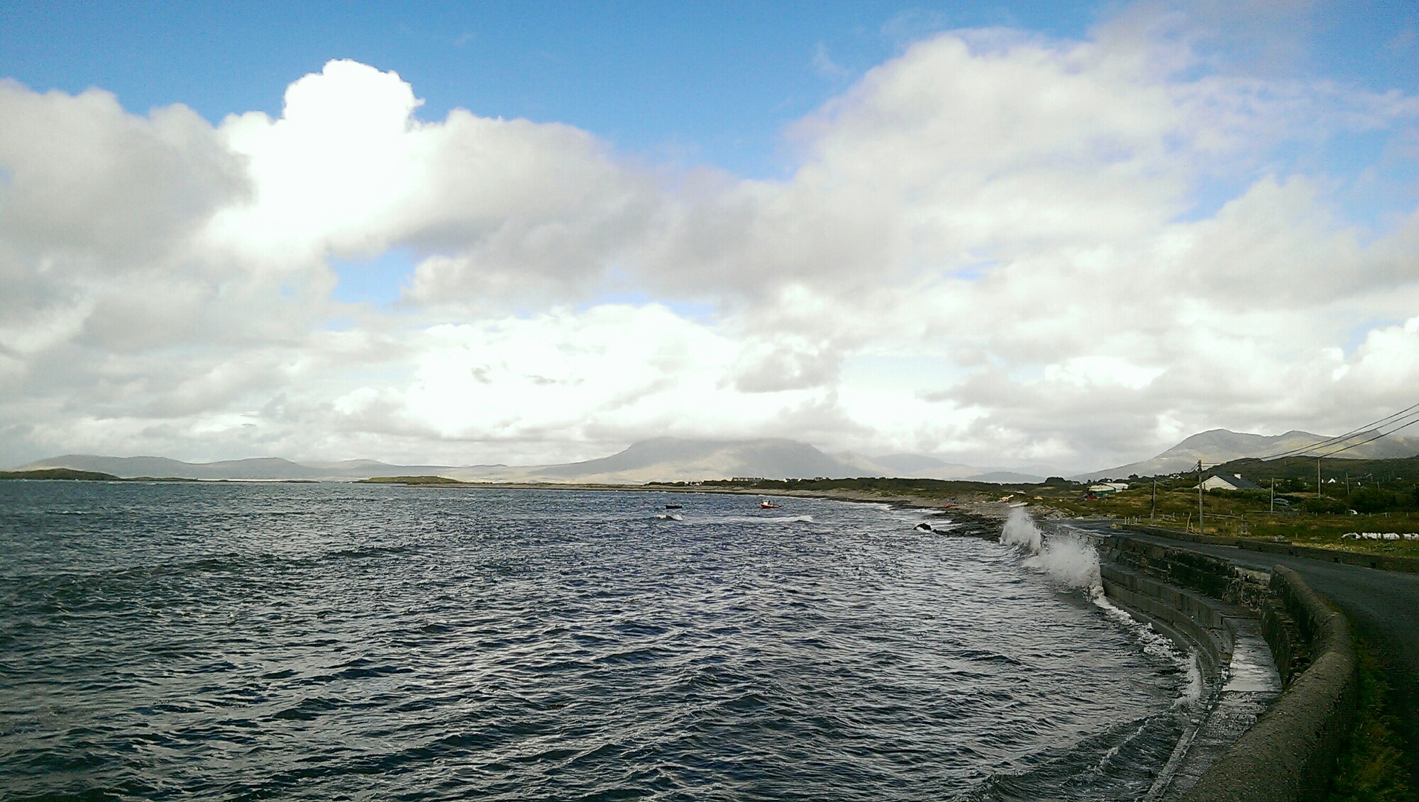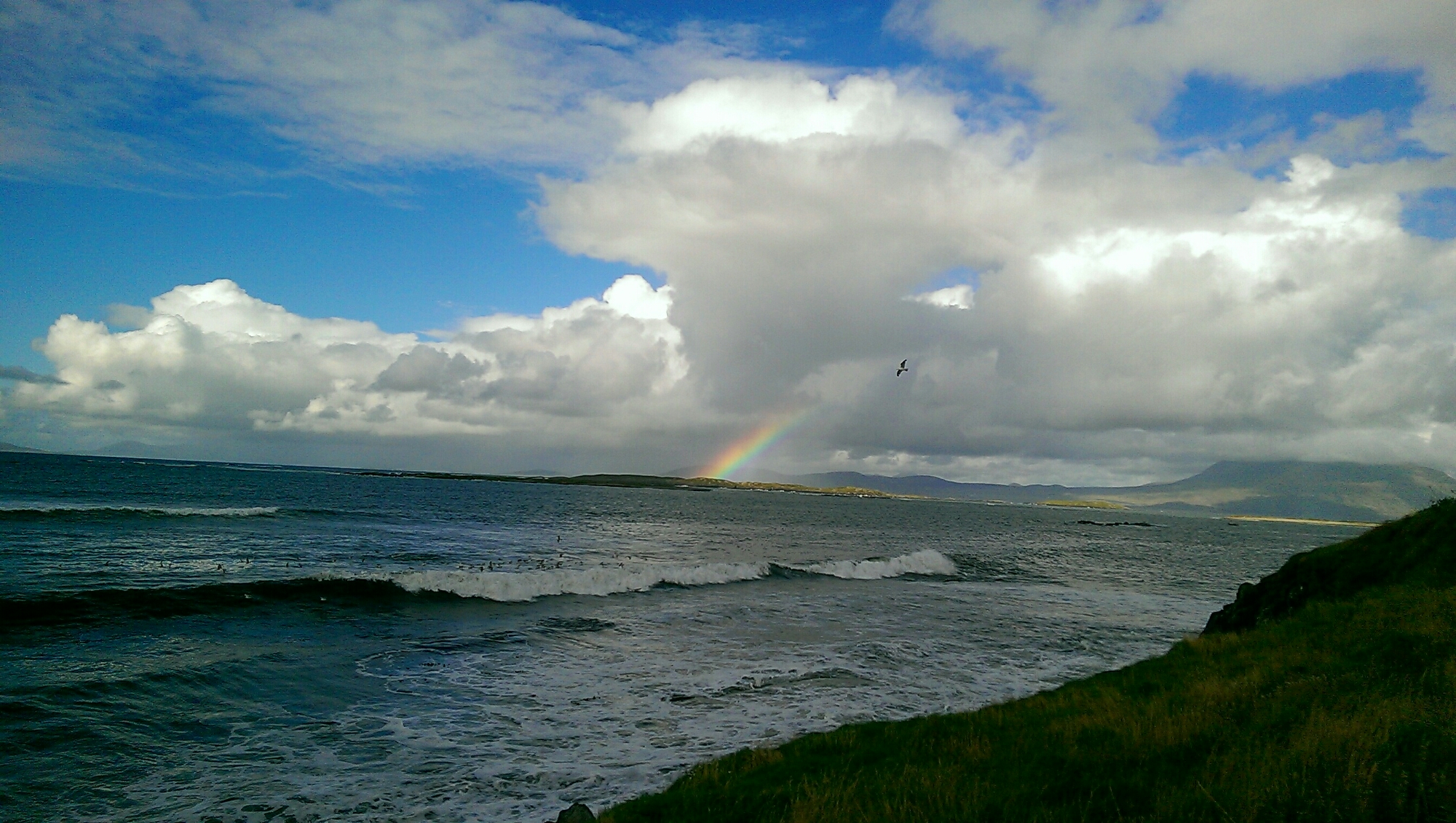 Cammini fino ad arrivare alla spiaggia di Renvyle. Il mare è molto mosso. Un padre con la muta fa fare il bagno alla figlia tenendola in braccio. Dei surfisti in lontananza aspettano le onde, tutti radunati in un punto. Poco più in là, un gruppetto di gabbiani galleggiano e gli fanno il verso.
