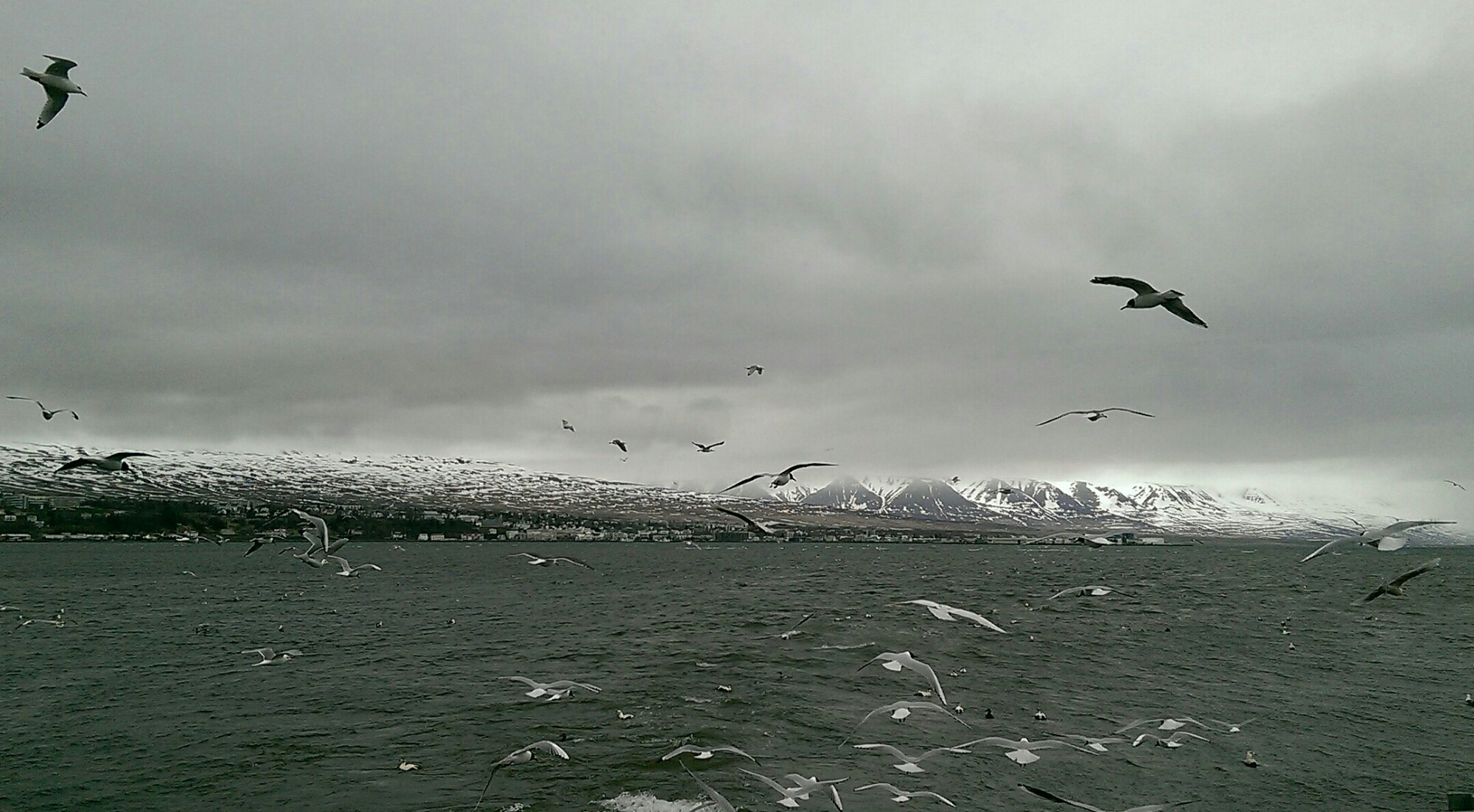 Sono le 16. Salgo in macchina prima che la neve si intensifichi e procedo in direzione Akureyri. Il viaggio è tranquillo e improvvisamente mi scende tutta la tensione accumulata. Un sonno improvviso mi pesa sugli occhi e poco prima di arrivare in città devo fermarmi in una piazzola di sosta per dormire un po’. Dopo una mezzora mi sveglio e riparto. Uno stormo di gabbiani è il comitato di benvenuto di Akureyri.